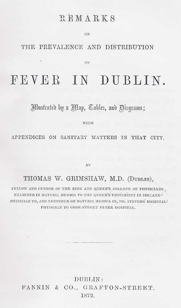 Grimshaw, Thomas Wrigley, 1867, On the Value of Thermometric Observations in Typhus Fever, Being a Thesis for the Degree of Doctor of Medicine Read before the University of Dublin on 4th March, 1867: Dublin, John Falconer, 18 p. (Linen Hall Library I.61)