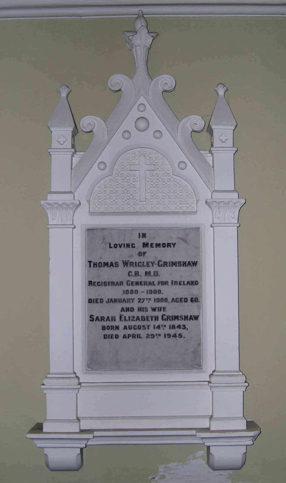 “In memory of Elizabeth Dorothia Grimshaw who worshipped in this church for nine years. Died August 17 1906. Also her husband Wrigley Grimshaw F.RC.S.I. died June 1878”.