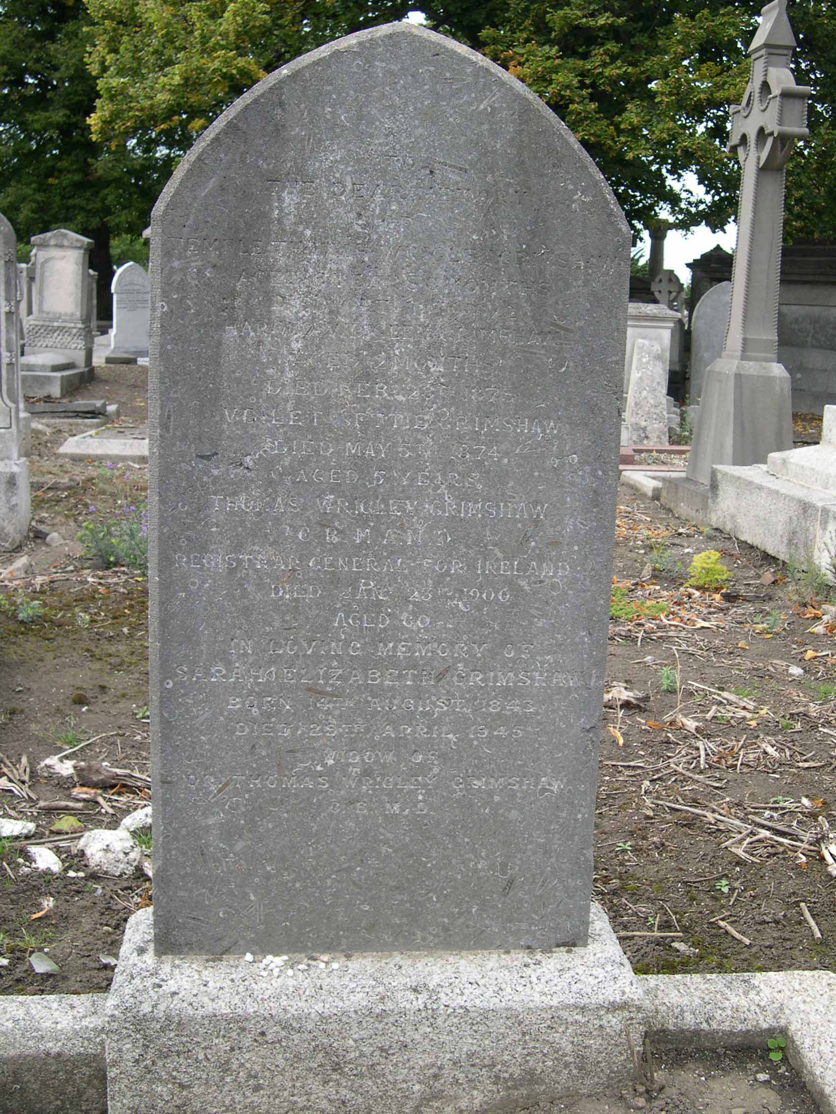 Hilary provided the following information from a visit she made to Mount Jerome Cemetery in Dublin in September 2004. Many of Thomas Wrigley and Elizabeth Grimshaw’s family members are included in this information.