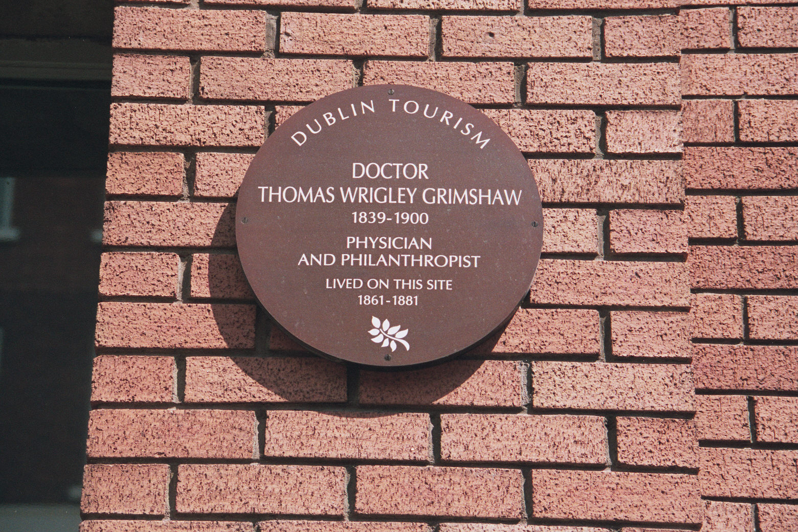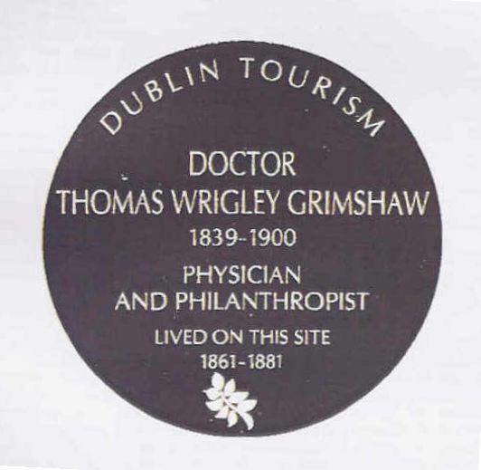 As it happens, Thomas Wrigley Grimshaw died almost exactly 100 years ago. He was a good Doctor. He must have saved many lives by his pioneering work. He had a fine scientific mind, but above all he had a great feeling for humanity. Having read even the few documents I have found about him, I felt he well deserved a plaque on the site where he lived. I had seen these handsome bronze plaques attached to several historic buildings during a recent visit to Dublin where my youngest daughter is continuing the family tradition by studying at Trinity College. I applied to Dublin Tourism who welcomed the idea of fixing a plaque on the site of No.13 Molesworth Street. Although that particular house has been demolished I believe No.15, with it’s date of 1755, gives a fair idea of how the house might have looked when Dr. Thomas Wrigley Grimshaw returned home from his gruelling house to house visits in the latter part of the 19th century.