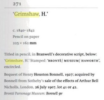 Bramwell Bronte, brother of Emily, Ann and Charlotte, made a pencil drawing of one “H. Grimshaw”, which is shown and described below from a book by Christine Alexander and Jane Sellars – “The Art of the Brontes”7. It is not known who this H Grimshaw was or which family he was descended from. (Note that Bramwell’s name is incorrectly spelled “Branwell” in the book.)