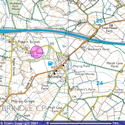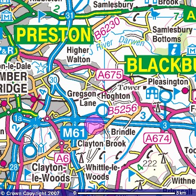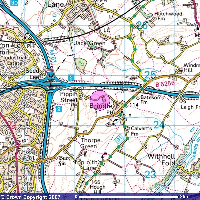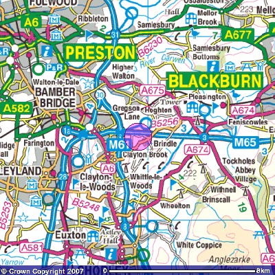 Brindle is in Lancashire, southeast of Preston and southwest of Blackburn, as shown on the maps below at larger scales above and smaller scales below.