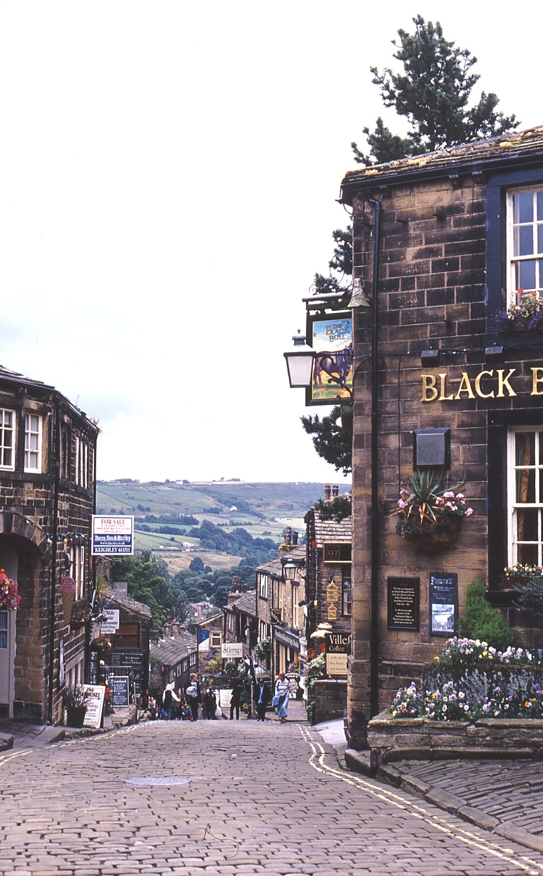 Located awkwardly between the Leeds-Bradford conurbation and barren Pennine moorland, the village will for ever be associated with the talented but tragic Bronte sisters. The Rev. Patrick Bronte was vicar here for forty-one years from 1820 and outlived all of his six children, including the literary trio of Charlotte, Emily and Anne. Apart from Anne, who died at Scarborough, all the family lie within a vault in the church. Following signs to the “Bronte Village”, tourists come in their thousands to amble up and down the steep cobbled Main Street, sipping tea in the cafes and browsing in the souvenir shops.