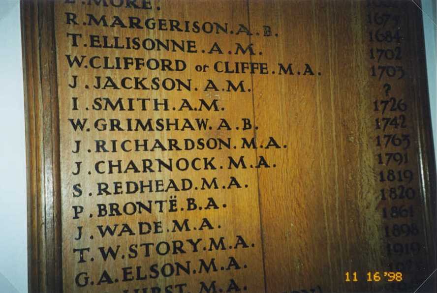 The third photo is a list of Haworth Church rectors on plaque inside the church. Note that Patrick Bronte was the fourth rector after William Grimshaw.